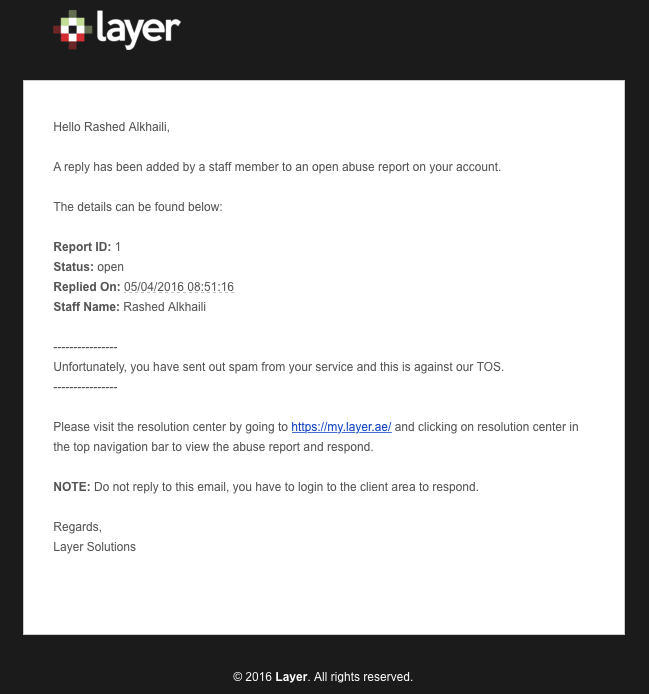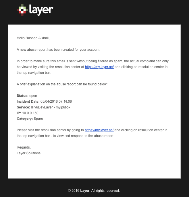 Report details show vital information to the customer, including the service in question, the IP, date of incident, the category of the abuse report, as well as the abuse report it self.