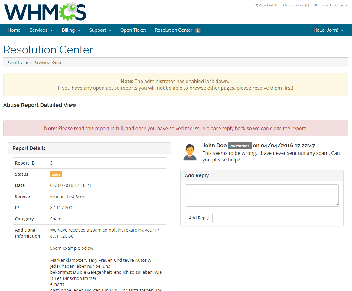Resolution Center link in top navigation bar (automatically shown), which shows a customer all their abuse reports - open and closed, with the ability to view both
