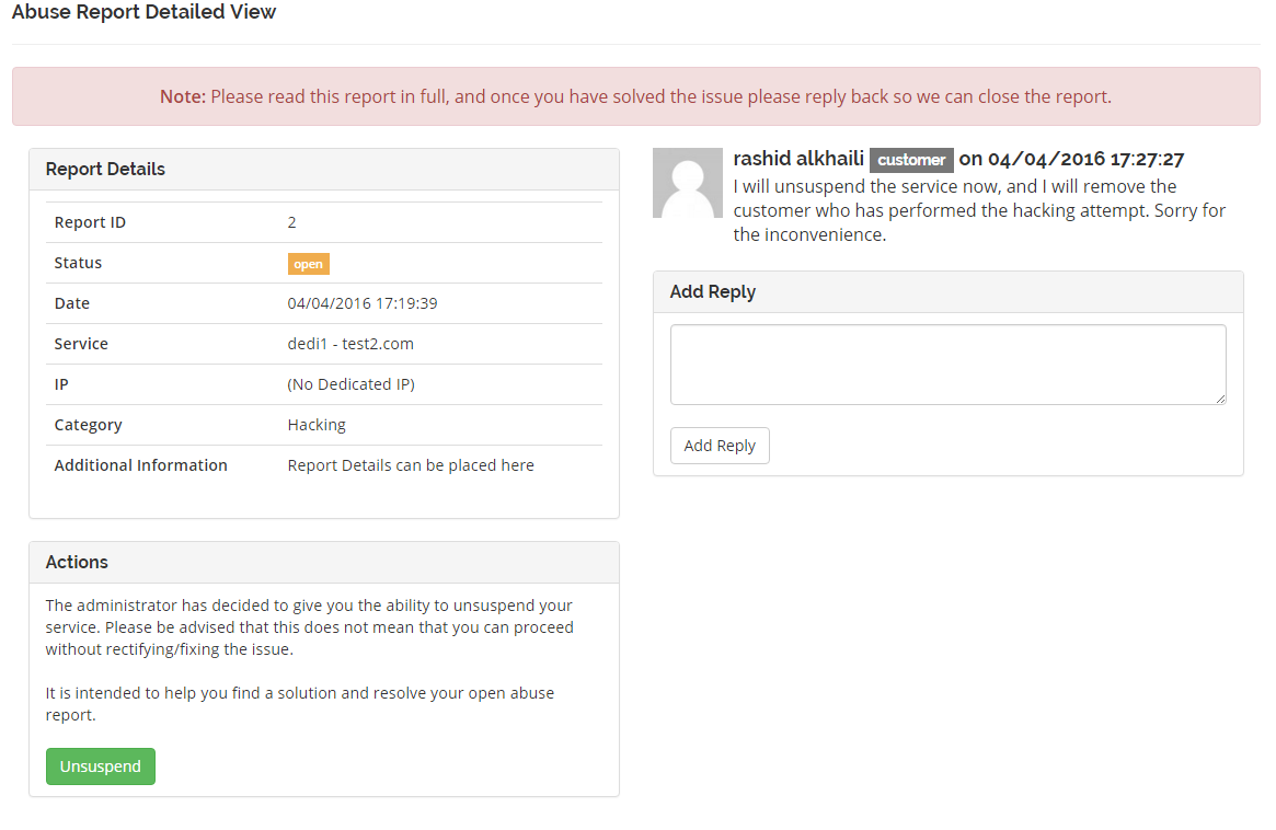 Admins have the ability of not suspending the service that relates to the abuse report, or suspend it immediately, or suspend it after a certain time limit passes. They also have the option to allow a customer to unsuspend themselves if required.