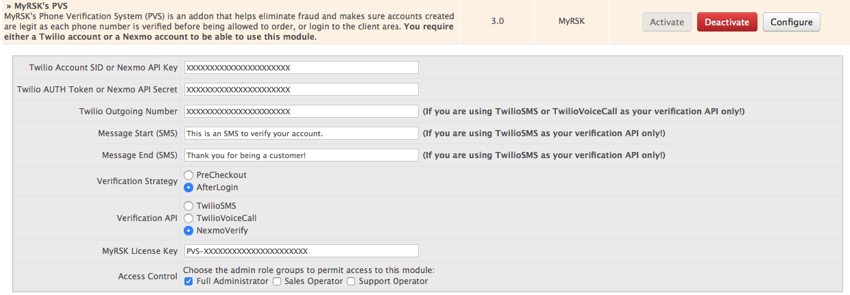 Phone Verification System (PVS) is a WHMCS addon that helps eliminate fraud and makes sure accounts created are legit as each phone number is verified to make sure it is real.